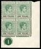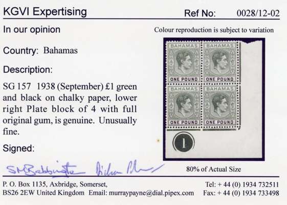 1938 £1 deep grey-green and black on chalky paper, lower right corner block of four with Plate 1, unmounted o.g. The gum is streaky and brown, fine for this printing. KG VI Expertising Certificate (2002). SG 157, £1000