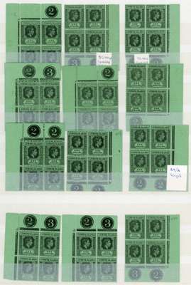 1942-51 1/- Plate blocks collection (15 plus a Plate pair) mint, mainly fine unmounted o.g. but a couple of hingemarks noticed. Also four other blocks (one grey and black block of six; another block of eight with R9/3 LP strengthened rosette). SG 110b, ba