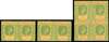 1943-4 5/- ordinary paper. Two unmounted o.g. pairs, one stamp in each with R6/4 LP damaged ‘A’ in LEEWARD (different states), and an unmounted o.g. block of four, top right stamp with R9/3 LP strengthened rosette. Good varieties. SG 112b vars