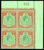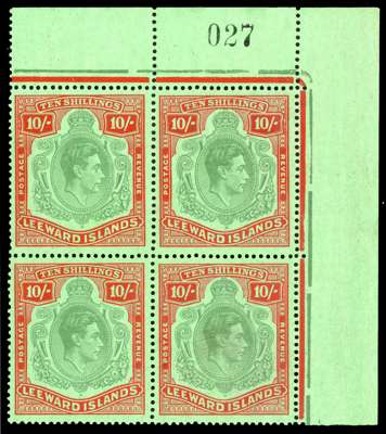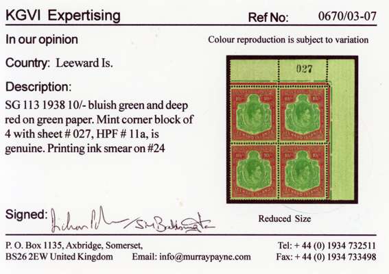 1938 10/- bluish green and deep red on green chalky paper top right corner block of four, with sheet number and HPF 11a “Adam's Apple”. Unmounted o.g., brownish gum as always; KG VI Expertising Certificate (2003), ‘Printing ink smear on #24’. SG 113