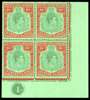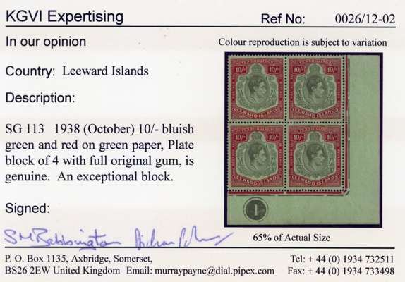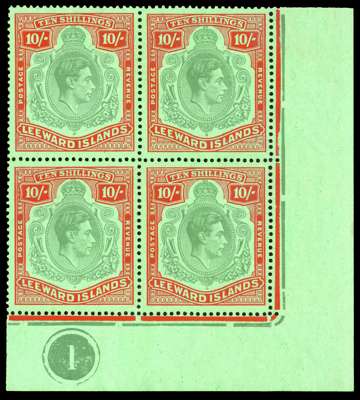1938 10/- bluish green and deep green on green ordinary paper, a fine unmounted o.g. Plate block with very fresh gum for this, KG VI Expertising Certificate (2002), ‘An exceptional block’. SG 113