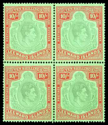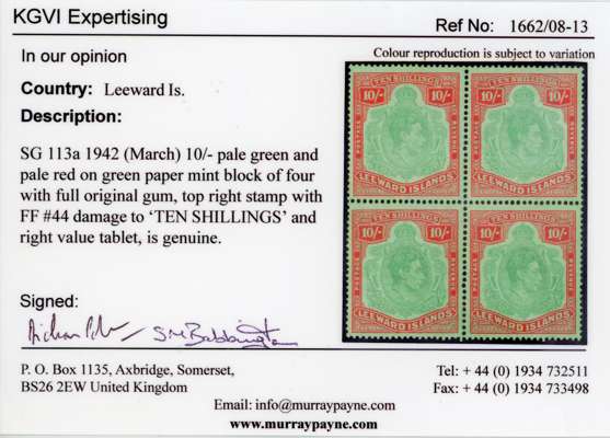 1942 (March) 10/- pale green and pale red on green paper, an unmounted o.g. block of four with the top right stamp showing the major Frame Plate #44, damage to TEN SHILLINGS and right value tablet. Unmounted singles of the basic stamp are scarce, multiples are rare and with the #44 must be very rare. KG VI Expertising Certificate (2008). SG 113a, £3400+