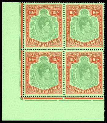 1944 (Dec.) 10/- deep green and deep vermilion on green paper (emerald back). Lower left corner block of four, very fresh unmounted o.g., HPF #49 ‘missing pearl’ (and sliced scroll). Fine multiple. SG 113c, ca, £2000