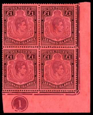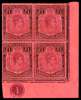 1942 (Feb.) £1 deep purple and black on carmine-red paper Plate block of four, o.g., hinged on the selvedge only. HPFs #59ii repair to top right scroll and the major #60 broken lower right scroll. The surface has picked up a little grease, as is natural for this stamp. Much rarer than the October 1942 printing, since there was no allocation for dealers, with the whole quantity despatched to the islands. SG 114a, ae, £2270