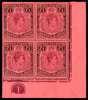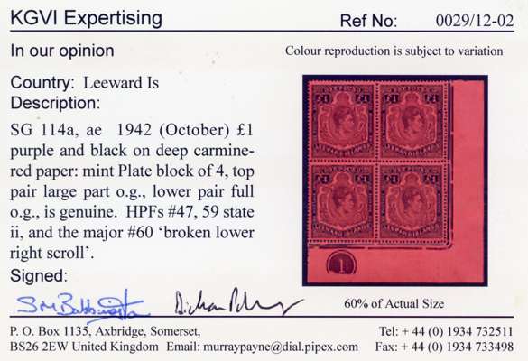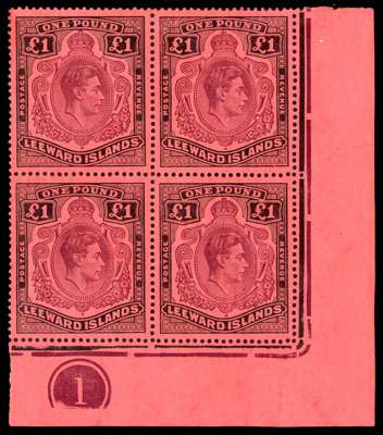 1942 (Oct.) £1 purple and black on deep carmine-red paper Plate block of four, HPFs 59ii repair to top right scroll and the major #60 broken lower right scroll. Lightly hinged on the top pair with the lower pair unmounted o.g. KG VI Expertising Certificate (2002). SG 114a, ae, £2270
