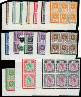 1954 set of fifteen in blocks of six, unmounted o.g. The ¼c to $1.20 values in lower left corner blocks save for the 24c, the ¼c, 3c-5c with R10/3 neck flaw; the 24c a top left corner block with R2/2 ‘loop’ flaw (state 2). The $2.40 and $4.80 each with R4/3 broken scroll. SG 126-140, a, £625