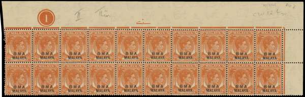 1946 2c thin striated paper top marginal block of twenty with Plate 1, the two left stamps damaged. Unmounted o.g. SG 2b, £400