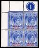 1947 15c blue on ordinary paper upper left Plate block of four, unmounted o.g. A scarce Plate block; KG VI Expertising Certificate (2003). SG 12ba