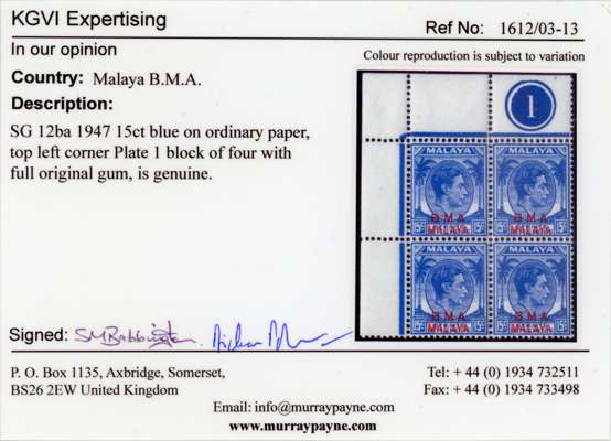 Malaya BMA SG 12ba Plate block mint