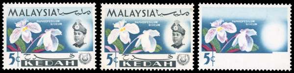 1965 Orchid 5c with black omitted (state name and head), unmounted o.g. Also a ‘normal’ stamp with the red printing exceptionally pale. SG 117a, £300