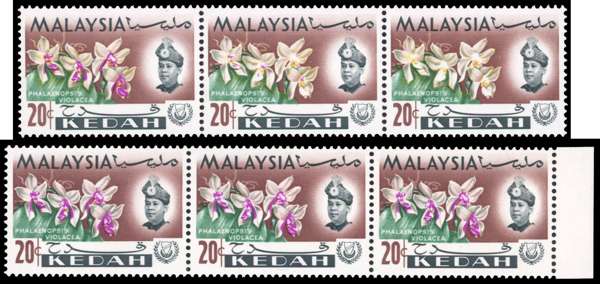 1965 Orchid 20c, two unmounted o.g. strips of three. One strip with left stamp normal, centre stamp with large part bright purple (blooms) omitted, and right stamp with complete omission; the other with the left and right stamps having large part of the yellow printing omitted, and the central stamp with total omission. SG 121a, b, £625+