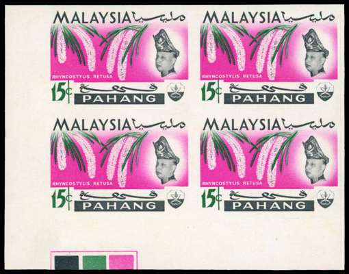1965 Orchid 15c lower left corner block of four with ‘traffic lights’, imperforate, unmounted o.g. Fine appearance but lightly toned on reverse, believed to be one of two such blocks. SG 86 var