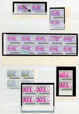 1965 Orchid varieties, unmounted o.g. 6c left marginal pair, the left stamp with partial omission of black giving ‘AYSIA’ and ‘ULAU PINANG’; 6c vertical pair, upper stamp yellow omitted; 6c marginal block of ten, pink printing smears affecting six stamps, one of them severely; 10c right marginal block with partially doubled horizontal perforations; 15c lower marginal pair, upper stamp with partial omission of green with just the lower tips of the leaves and the value remaining (very lightly toned on reverse); 15c Cylinder block of four, imperforate between stamps and right margin. SG 69-71 vars