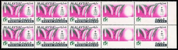 1965 Orchid 15c block of ten, marginal at right. The fourth and eight stamps show complete omission of black printing and the stamps to the right with a large part omission, those to the left with a small part omission. A spectacular multiple, unmounted o.g., but with some sparse light foxed spots on reverse. SG 71c, £3200