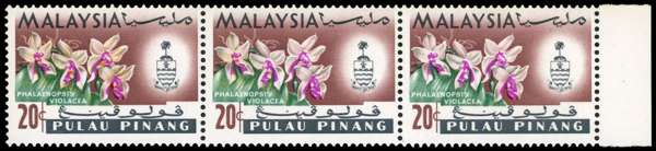 1965 Orchid 20c strip of three, marginal at right, with the centre stamp showing large part omission of yellow (petals) and the right stamp complete omission. Unmounted o.g. SG 72b, £1000+