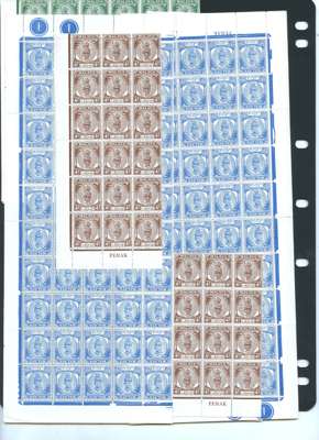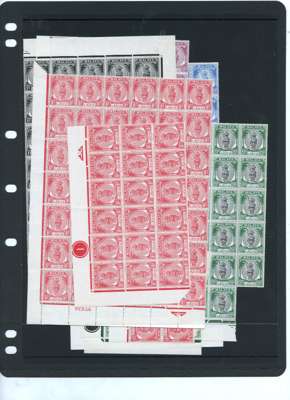 1950-6 values in (mostly) larger mint blocks. 1c (1 block, 40 stamps); 3c (2, 60, 1 Plate block); 4c (2, 60, 1 Plate block); 8c scarlet (2, 60, 1 Plate block); 10c (3, 120, 2 Plate blocks, numbered 1 and 2); 12c (1, 12); 15c (1, 40, 1 Plate block); 20c black and green (3, 74, 1 Plate block); 20c blue (4, 150, 2 Plate blocks). Some folds, otherwise fine. SG 128/140, £1363