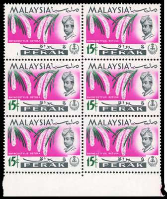 1965 Orchid 15c bottom marginal block of six, upper left stamp with value omitted (apart from small part of the vertical stroke), unmounted o.g. SG 168 var