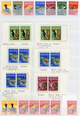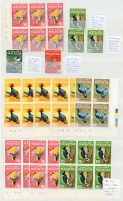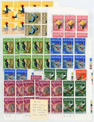 1965 Birds high values collection, unmounted o.g. Set; varieties in pairs including $2 ‘egg’; colour shifts including $10 with ‘white throat’; 50c corner example with scarlet omitted; 50c block of six with progressive loss of black printing on bird's tail; further singles and blocks with some varieties. SG 20-7