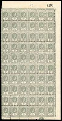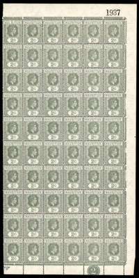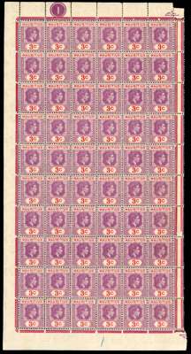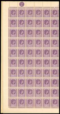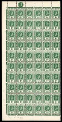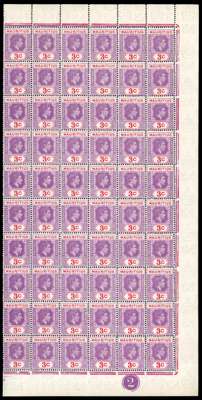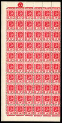 1938-49 values in complete panes. 2c perf 15 x 14 three right panes each with R10/5 serrated edge, two a little toned; 3c Plate 1 left pane, toned gum, Plate 2 RP (reddish lilac and red) with R2-3/2 sliced ‘S’ and 10/5 serrated edge; 4c Plate 3 LP with good varieties; 5c Plate 2 LP in fairly poor condition, Plate 2 complete sheet ex Peter Brooks, 1944 printing, and 10c Plate 3 LP with R4/1 sliced ‘S’. Fine group for study