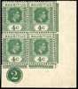 1942 4c deep dull green unmounted o.g. Plate 2 block of four, R9/6 open ‘C’ and 10/5 serrated edge. Usual gum for the early Plate 2 printings, very fine for this. SG 254a, b, £700