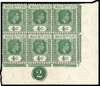 1943 4c deep dull green Plate block of six from the right pane, R9/6 open ‘C’ and 10/5 serrated edge, unmounted o.g. with light natural toning. SG 254ca, cc, £510
