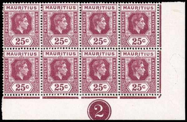1941-3 25c ordinary paper Plate block of eight with R10/5 RP serrated edge, unmounted o.g., also with R10/3 damage to letters in name tablet. SG 259bb, £300