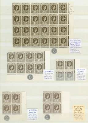 1942-8 1r blocks group, unmounted o.g. Two Plate 2 blocks on ordinary paper, each with lightly toned gum; the remainder late printings on chalky paper. Plate 3 lower four rows of RP. a couple of light bends and a couple also very lightly foxed, still a fine multiple with R7/6 RP sliced ‘I’; a further block with sliced ‘I’ and a fine Plate 3 block of eight. SG 260b, c (although some are 1948 chalky paper printings, rather than 1949)