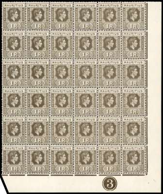 1949 1r drab on chalky paper lower six rows of RP with Plate 3, unmounted o.g. which is creamy, R6/1 battered ‘A’. A rare large multiple, fine. SG 260c, ca. £2925