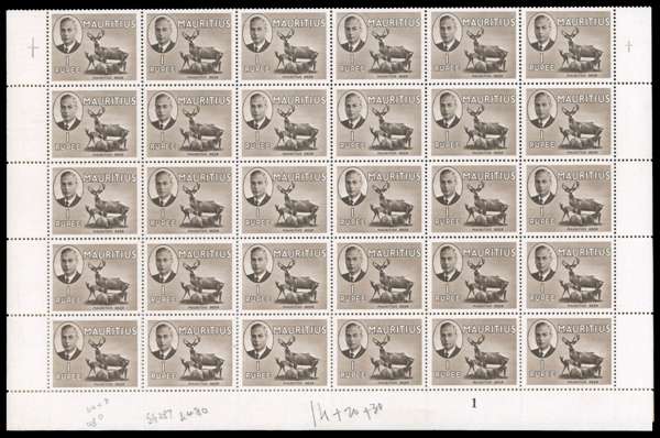 1950 unmounted o.g. multiples with 2c, 25c and 30c blocks of six with positional varieties described; 1r complete sheet of sixty, foxing affecting the top selvedge; 2r, 5r and 10r blocks of ten, the 10r a Plate block. SG 277/290, £1398
