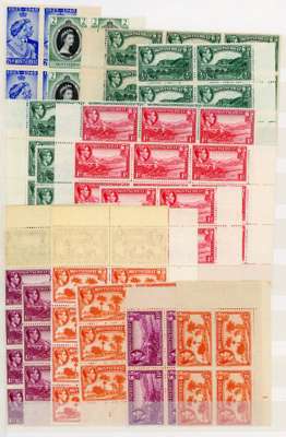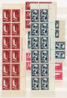1938-53 mint multiples, unmounted o.g. Many are toned, some heavily, but some are fine. Multiples from the 1938 set include1½d, 2d and 2/6d perf 13 plate blocks but gum heavily toned, perf 14 2/6d and 5/-imprint blocks, two of each, OK; 5/- perf 14, 10/- and £1 lower left corner blocks of twelve and 10/- and £1 similar blocks of eight, all with imprints, lightly toned. Highly catalogued
