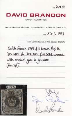 1889 $10 brown with R2/1 DOLLAPS, brown o.g., probably unmounted but with small disturbance at top; a little faint foxing, two short perfs at base. Brandon Certificate (1997). SG 50b, £1500