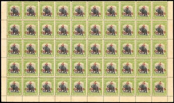1916 4c on 6c black and olive-green surcharge Type 67 lower five rows of sheet, R2/5 in each setting inverted ‘S’. Unmounted o.g., a little foxing on the reverse just affecting one of the varieties. SG 187, a, £2064