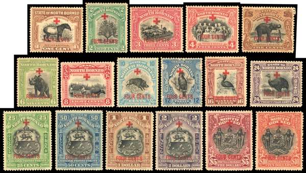 1918 (Oct.) Red Cross set of seventeen unmounted o.g., variable gum toning. Scarce. SG 235-252, £900