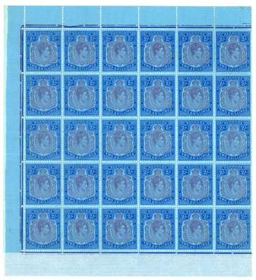 1941 (Oct.) 2/- mottled paper. Right half-sheet wit appropriate flaws including HPF #60 broken lower right scroll unmounted o.g., a couple of folds, minor marginal splitting and one internal foxed perf; and left half-sheet, reasonable appearance, HPFs including #17 gash in chin, but creased, and foxed on reverse. SG 116c, ce, cf