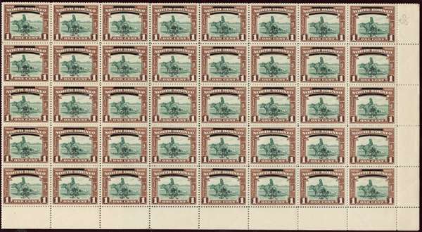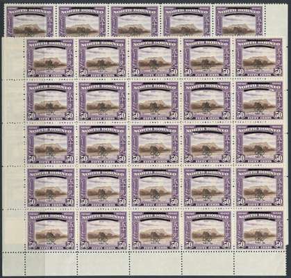 1947 Royal Cypher 1c and 50c broken bar varieties, unmounted o.g. 1c sheet of 100 with relatively minor states of R8/4, 8/8 bar broken at left (but no ‘ant trail’ at the latter position); 50c two bottom quarter-sheets (reverse very slightly two-toned) with R8/3, 8/4 and 8/8 broken bars and the very large, uncatalogued R7/6 part of lower bar missing at right, a significant variety. Interesting. SG 335c, 346, b, c