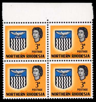 1963 3d top marginal block of four with orange (eagle) drastically misplaced, appearing under RN RHOD, unmounted o.g. SG 78 var