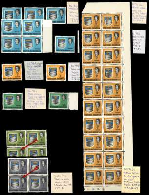 1963 varieties unmounted mint. 1d missing value block and single, also pair and three singles with varying misplaced value; 3d value omitted, also dropped eagle and misplaced value; 4d two examples with value omitted, and one with good misplacement of value. Also blocks of four of the 6d and 1/- and twenty of the 9d, each with parting flaw. SG 75-82c