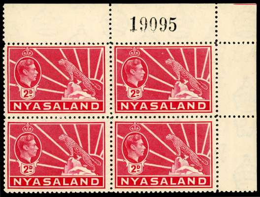 1942 2d carmine corner block of four with sheet number, R1/5 with ‘A’ of CA omitted from watermark. Unmounted o.g. with toned gum. SG 133a, £1600