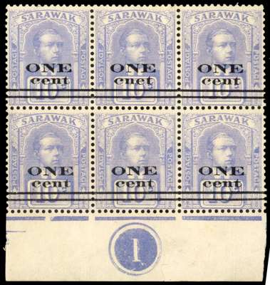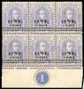 1923 1c on 10c dull blue (first printing) lower marginal block of six with Plate number, the middle top stamp with “cnet” variety, large part o.g. The right pair (splitting away) shows doubling of POSTAGE and right frame. SG 72, a, £465
