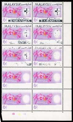 1965 Orchid 6c lower right corner Cylinder block of ten, showing progressive omission of black with the lower four stamps showing complete omissions, the black Cylinder number also omitted. A dramatic multiple. SG 215a, £1600+