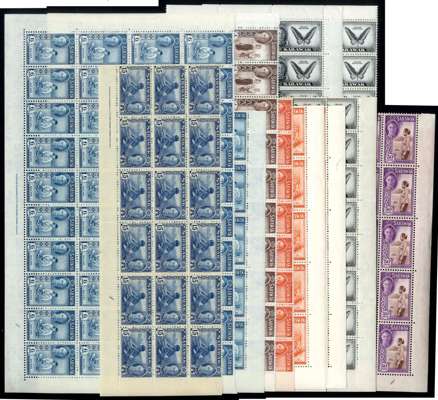 1889-1952 mint group with 1889-92 5c on 12c Type 8 with stop, disturbed toned o.g.; no stop, unmounted; Type 9 with stop unmounted (very lightly toned) and no stop, small part o.g.; miscellaneous shades and 1923 surcharges; 1932 set (toned); 1947 Cypher $1 with confetti flaw, large part o.g., unusual; Wedding imprint block, toned, and Plate block lightly toned; 1950 sets (3) and $5 Plate block of four. Also 1950 values large multiples with 1c sheet of 100 plus two blocks of 40 each; 2c imprint and Plate block of 14 pus two sheets of 100, dated 11/52 and 8/53; 4c block of 40; 6c blocks of 50 and 40; 15c block of 18; 50c block of 38. Variable amounts of toning throughout with much acceptable