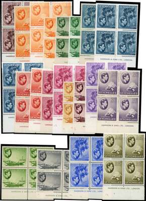 1938-49 imprint blocks (21), including better printings, mint, mainly fine unmounted o.g. Includes 1949 9c (hinged on selvedge), 1949 18c, 1941 20c brown-ochre (brown gum),1941 75c lilac (brown gum), 1938 1r yellow-green and 1941 1r grey-black, both brown gum, 1938 1r ultramarine and 2r25 olive; generally fine and all of good appearance. SG 135/148