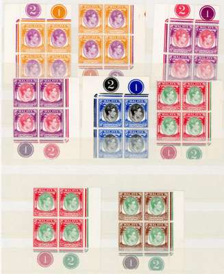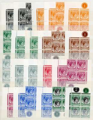 1948 perf 14 Plate blocks with duplication, unmounted o.g. (at least one block hinged on the selvedge) From one to three of each (no $1) with 15c x 40c (2, one stamp with inclusion); 50c (stained), $2 x 2 (one with light bend) and $5. Generally good. SG 1/15