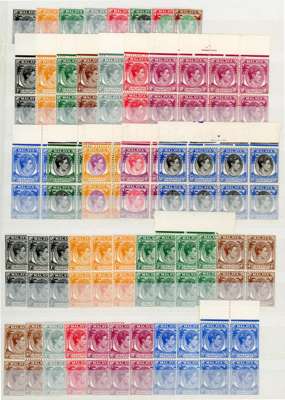 1948 perf 14 values unmounted o.g. with eight values to $2 and $5 singles; the remainder in blocks. 1c - 50c top marginal blocks of eight; duplicated blocks of four to 50c (two or three of most); 15c Plate blocks of eight and ten, 25c Plate block of six and 1c sheet and lower half-sheet. SG 1/15