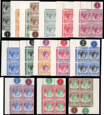 1948 perf 14 set of fifteen in Plate blocks of four, unmounted o.g., the $1 with a very small selvedge fault at top. SG 1-15, £800