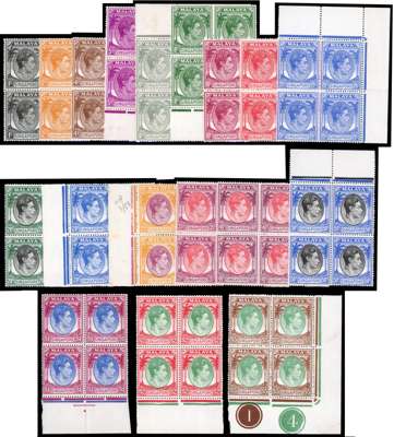 1949-52 perf 17½ x 18 set of eighteen in unmounted o.g. blocks of four, the $5 a Plate block. The 6c and 20c hinged on the selvedge, the $5 with a crease at the corner of the selvedge, otherwise fine. SG 16-30, £1900