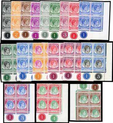 1949-52 perf 17½ x 18 set of eighteen in Plate blocks of four, unmounted o.g. save the 40c hinged on the selvedge. The 40c block with one toned perf, the $5 with some faint foxing on reverse affecting three stamps. SG 16-30, £1900