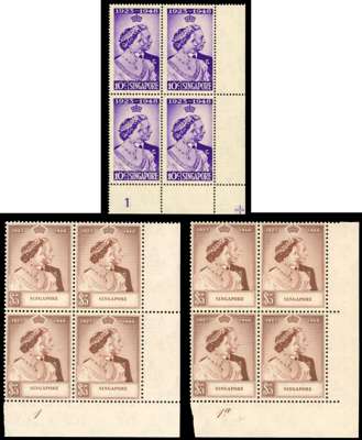 1948 Silver Wedding. 10c Plate 1 block of four, $5 two Plate blocks of four with1 and 1a, unmounted o.g.; toned gum. SG 31-2, £804