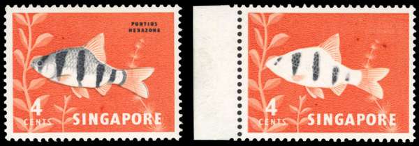 1962-6 4c black and orange-red, unmounted mint with margin at right. Shows partial omission of black, with fish's name wholly omitted. SG 65 var