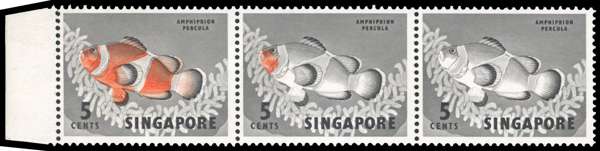 1962 5c Orange Clownfish strip of three, marginal at left, the right stamp with complete omission of the orange-red and the second stamp with large part omission. Unmounted o.g. SG 66a, £1400